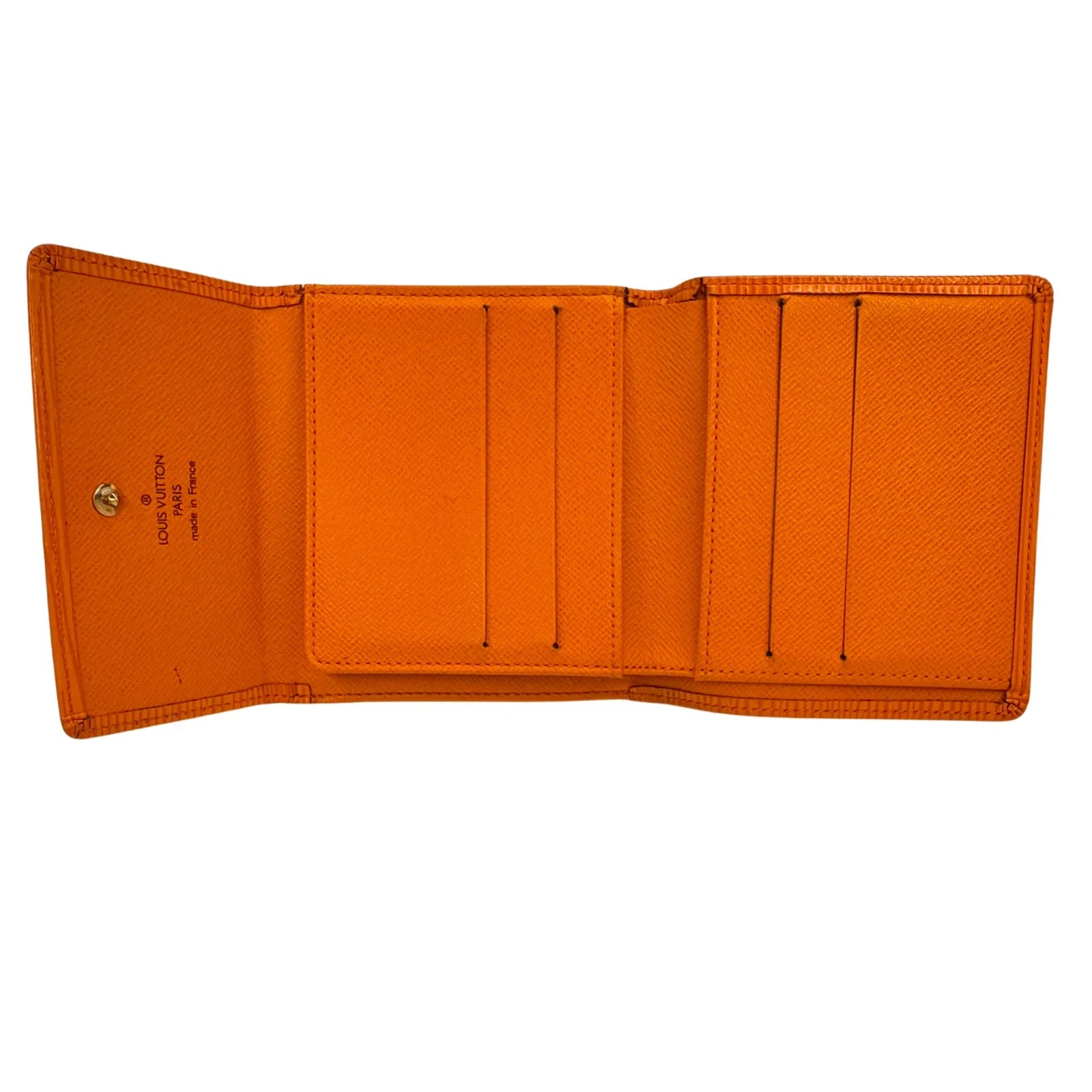 This Louis Vuitton wallet is crafted from smooth orange leather, offering a vibrant and contemporary finish. Its structured design opens to a practical interior with eight pockets, ideal for organizing cards, cash, and essentials. The sleek profile and bright tone make it a standout yet functional accessory for daily use.