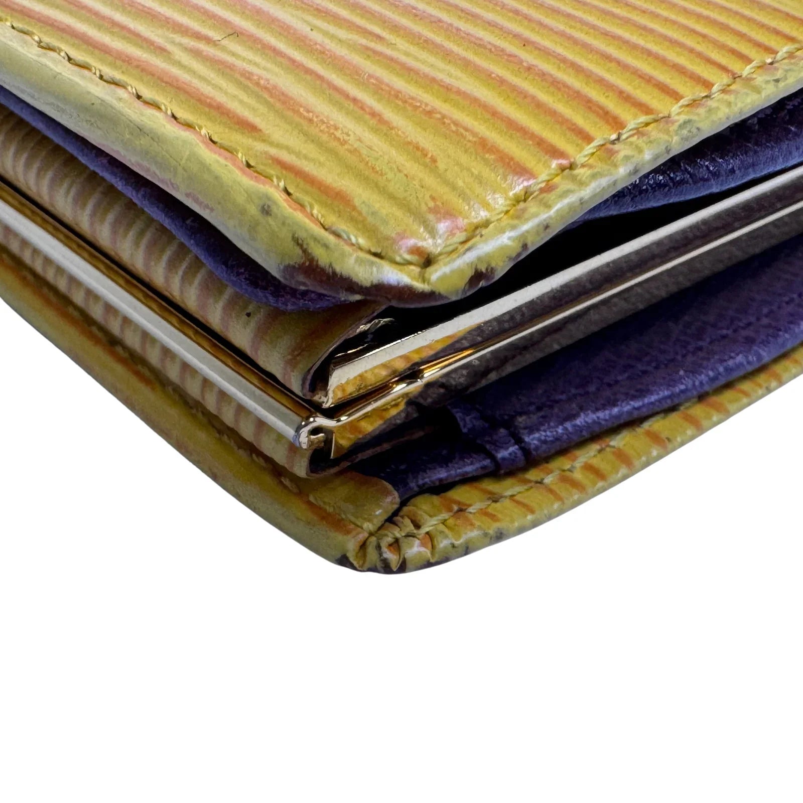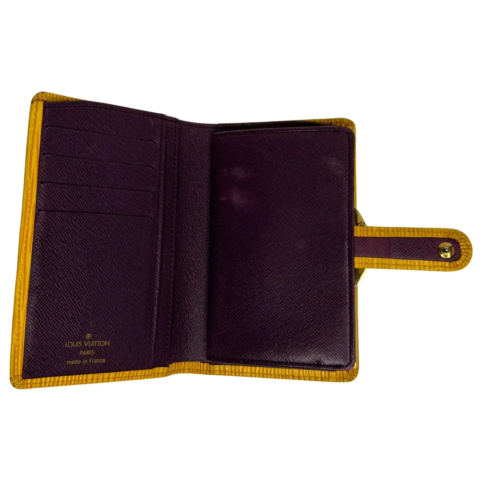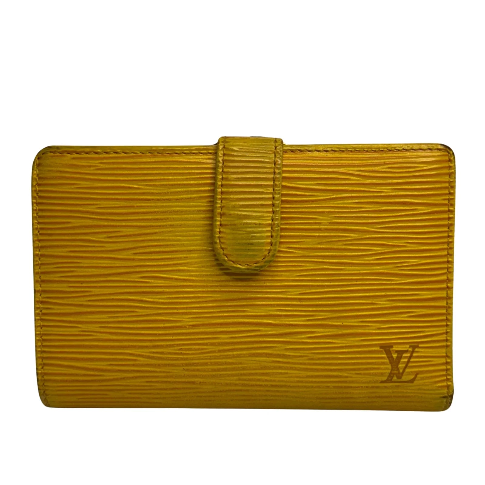 This Louis Vuitton wallet is crafted from supple yellow leather, offering a bright and refined aesthetic. Compact yet functional, it opens to reveal seven interior pockets, making it a practical choice for everyday use. The leather piping and trim give it a classic Louis Vuitton finish.